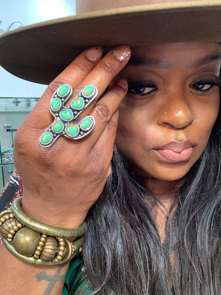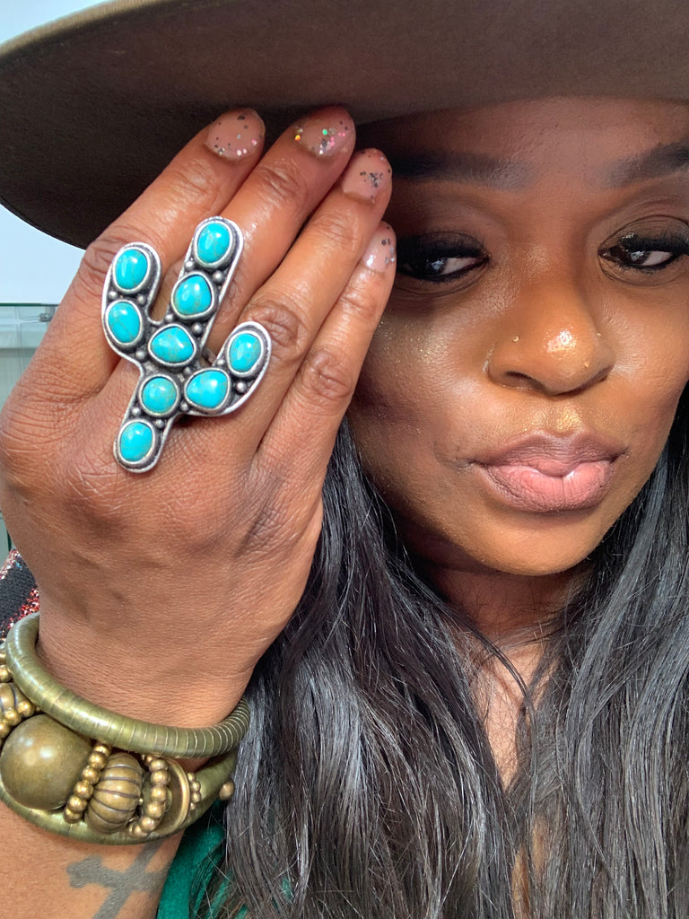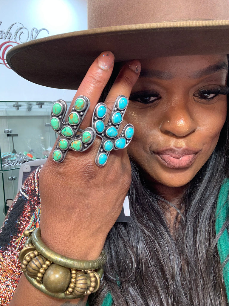 Not your average ring, this is a whole moment! Featuring vibrant howlite inspired stones in a bold cactus bloom design, this statement piece brings that desert glam energy straight to your fingertips. Lightweight but eye catching, its made for the ones who don't mind standing out. Throw it on and let your hands do the talking.